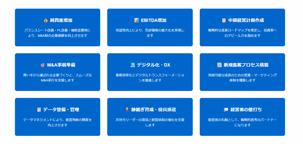 事業計画の策定だけでなく、現場の業務プロセス改善やITシステム導入、営業・マーケティング活動など、多面的なハンズオンで実行まで伴走します。